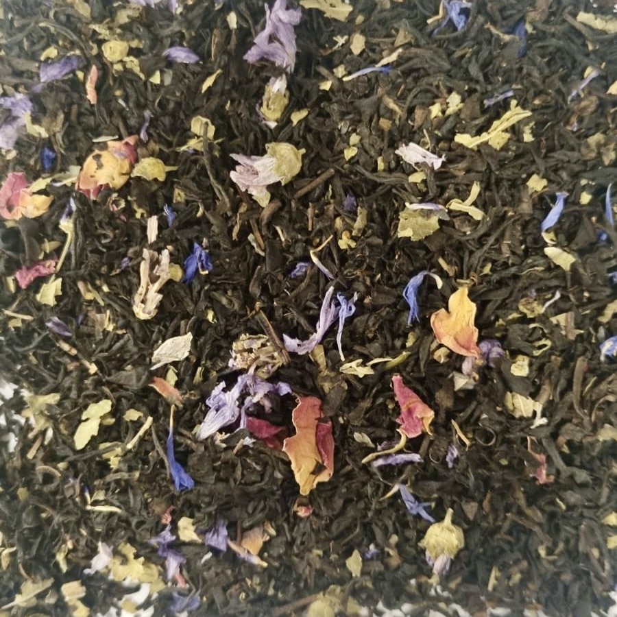 Thé noir Keemun à la violette, relevé de verveine et de pétales de rose, pour une pause raffinée.